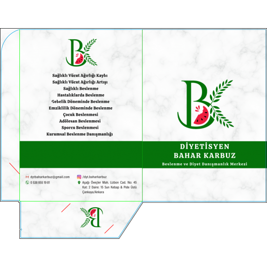 İster bireysel diyetisyen olun ister bir beslenme merkezi yönetin, dosyanız size özel tasarlanır. Renk paletiniz, logonuz ve font seçiminiz ile markanızı yansıtan özgün bir tasarım hazırlanır. Ücretsiz tasarım desteğiyle profesyonel sonuçlar elde edebilirsiniz.