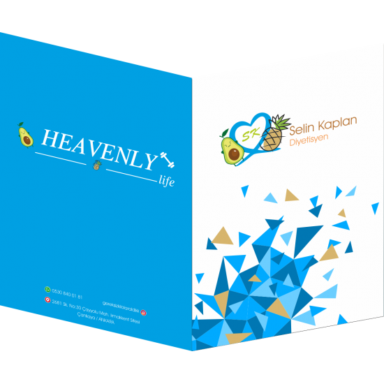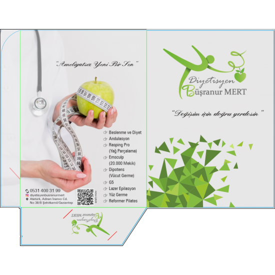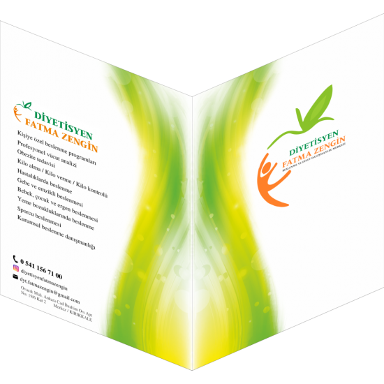 Diyetisyen cepli dosyalar, beslenme uzmanları ve diyetisyenler için özel olarak tasarlanmış kurumsal sunum dosyalarıdır. Danışan kayıt formları, ölçüm bilgileri ve beslenme planları gibi belgelerin düzenli şekilde saklanmasını sağlar. Üzerine diyetisyen adı, logo ve iletişim bilgileri eklenebilir.